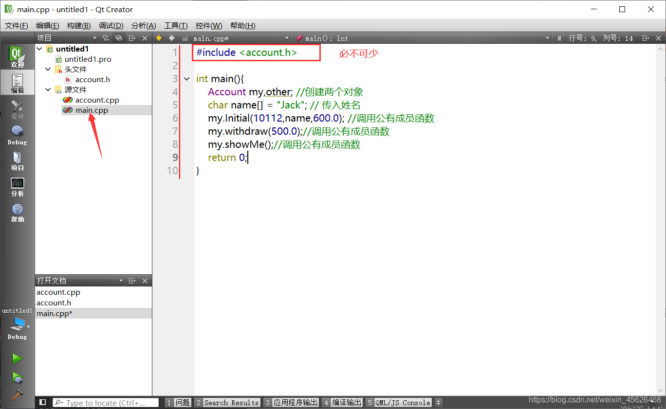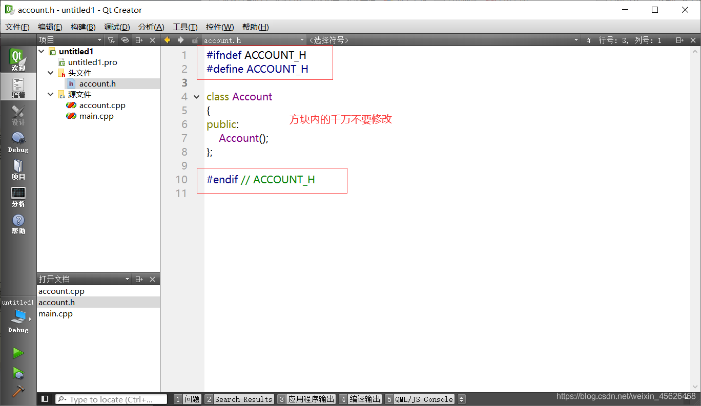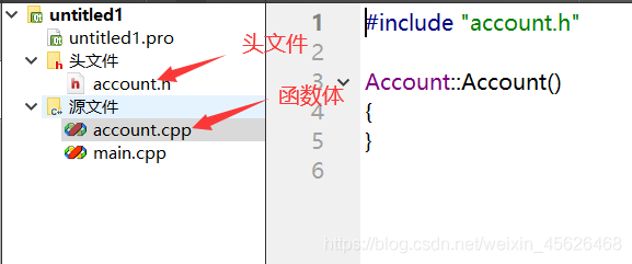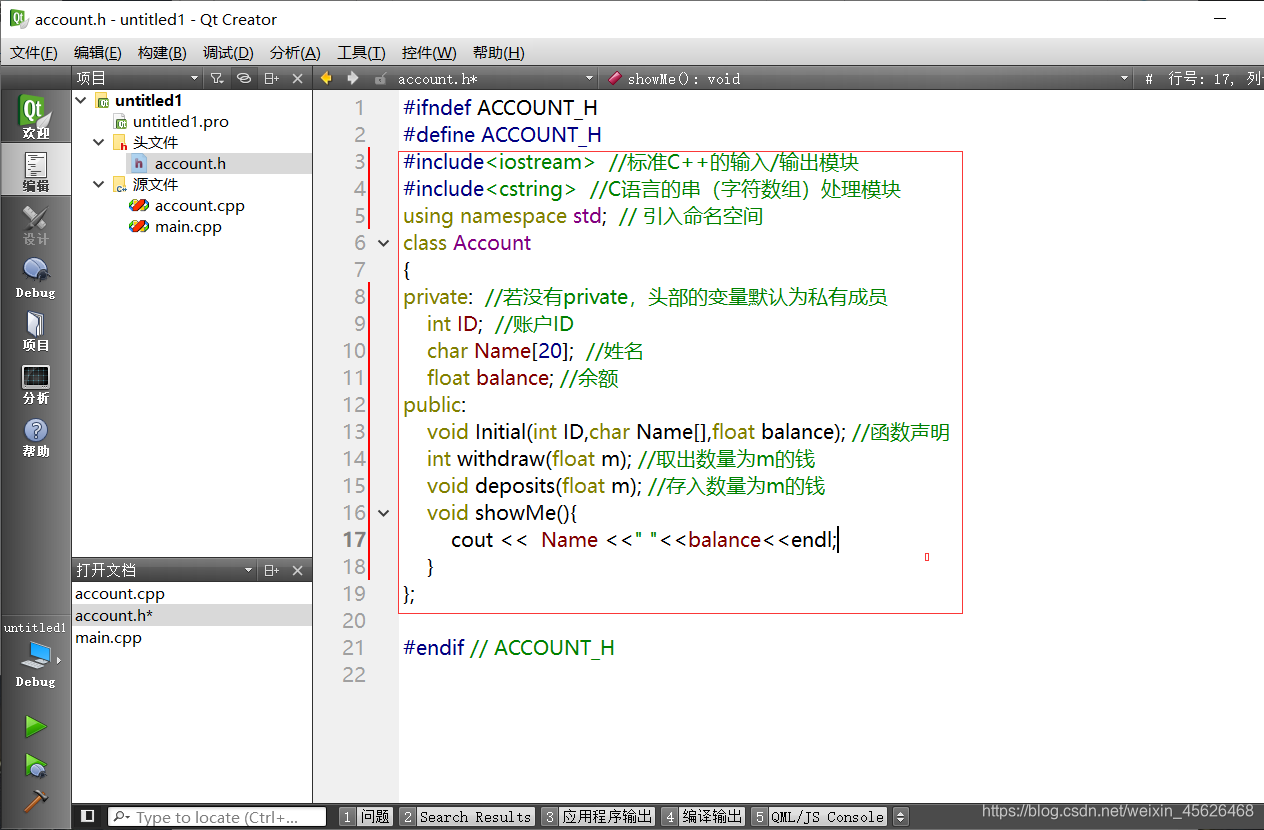 以上是头文件的内容,函数声明后,将在account.cpp内补充。