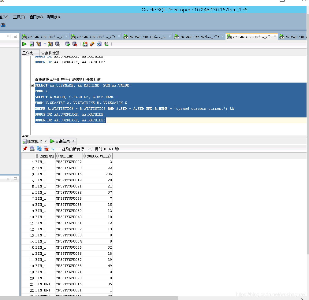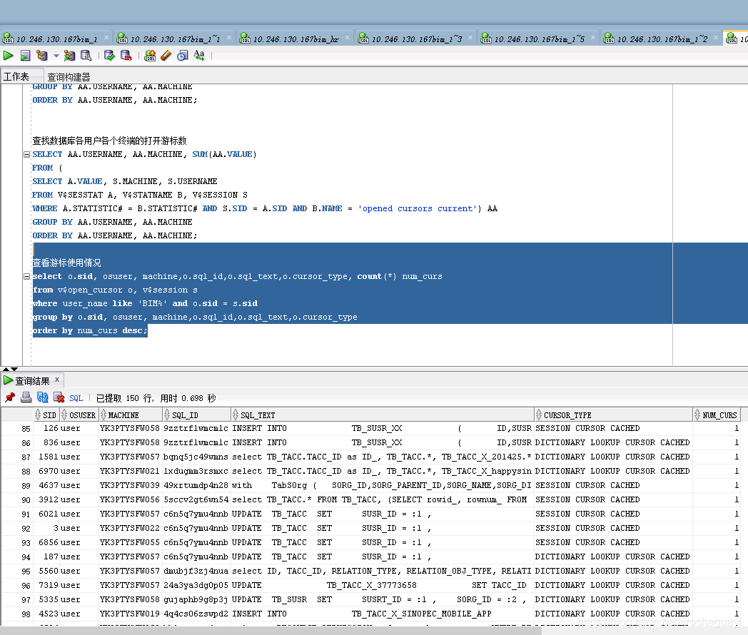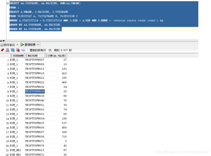 open_cursors		 300		      18%SQL>  查询游标使用排名select SID,count(*) from v$open_cursor O WHERE O.user_name like 'BIM%' GROUP BY O.SID