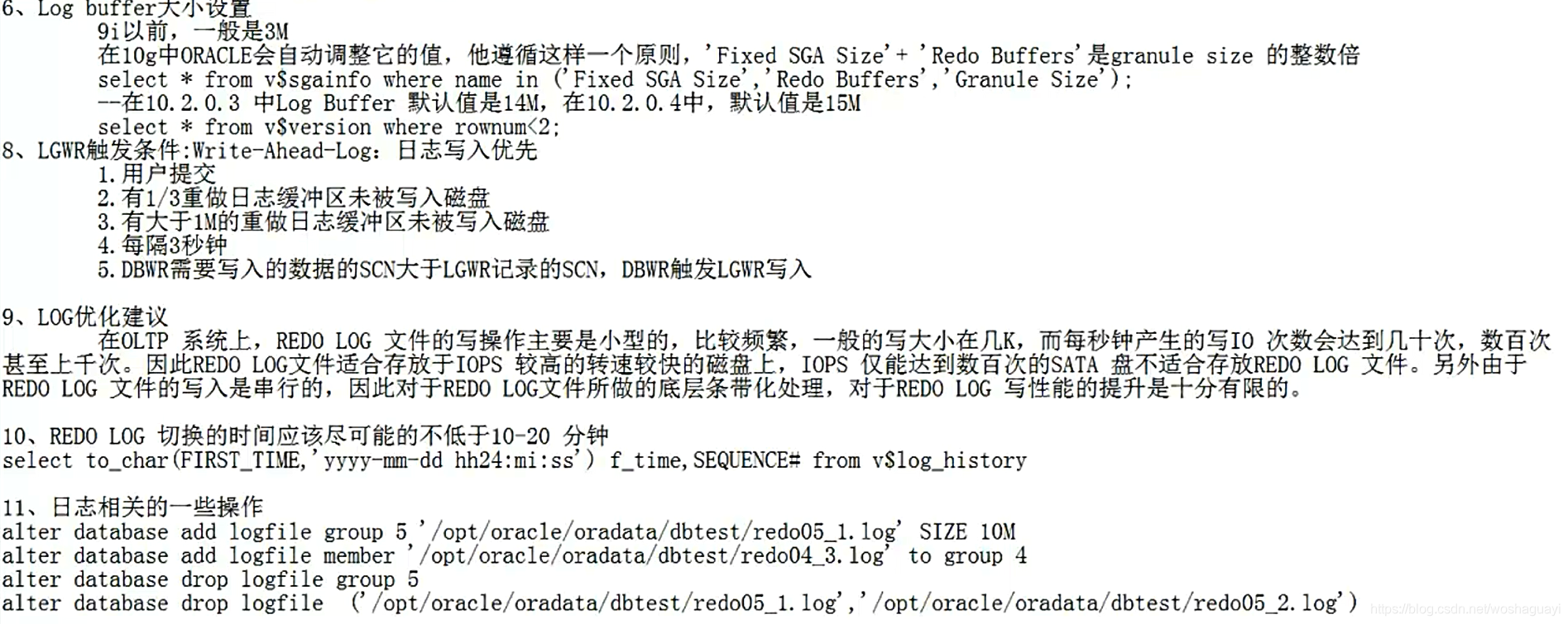5. DBWR需要写入的数据的SCN大于LGWR记录的SCN,DBWR触 发LGWR写入9、L0G优化建议