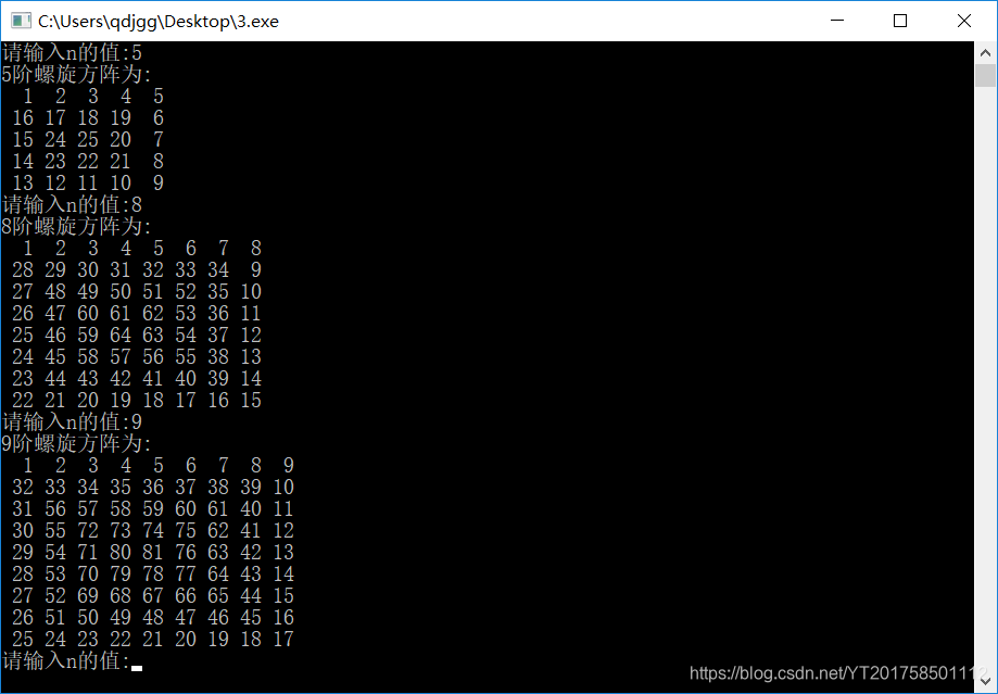 {int n;while(~printf("请输入n的值:")){scanf("%d",&n);memset(arr,0,sizeof(arr));int cnt=1;int i=1,j=1;arr[1][1]=1;while(cnt<n*n) //当改变到最后一个数值时跳出{while(arr[i][j+1]==0&&j+1<=n){cnt++;arr[i][j+1]=cnt;j++;} //将当前行按顺序改变直到边界或遇到一已经改变的位置while(arr[i+1][j]==0&&i+1<=n){cnt++;arr[i+1][j]=cnt;i++;} //将当前按顺序改变直到边界或遇到一已经改变的位置while(arr[i][j-1]==0&&j-1>=1){cnt++;arr[i][j-1]=cnt;j--;} //将当前按顺序改变直到边界或遇到一已经改变的位置while(arr[i-1][j]==0&&i-1>=1){cnt++;arr[i-1][j]=cnt;i--;} //将当前按顺序改变直到边界或遇到一已经改变的位置}printf("%d阶螺旋方阵为:\n",n);for(i=1;i<=n;i++){for(j=1;j<=n;j++){printf("%3d",arr[i][j]); //使每个数字占三位}printf("\n");}}return 0;