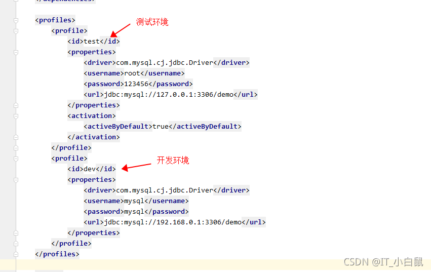 在打包的时候指定是测试环境还是开发环境进行不同的打包,实现这样的一个功能就是使用profiles标签了,先将两种不同环境的数据录入到profiles标签中,如下所示(activeByDefault为默认配置):