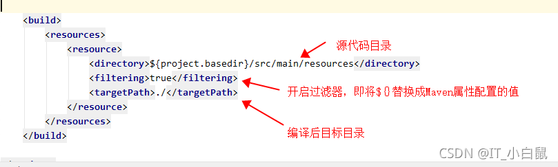 此定义即指,当mvn命令执行时,我们需要通过加上 -P dev或者-P test方式传入我们的需要指定的profile的id:dev/test选择,会导致properties里的变量值含义不同,这个操作需要在build标签中添加一个资源复制: