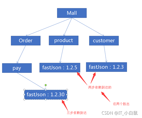 1、路径最短原则:product和customer里的fastjson引用路径较短,路径为两步 ;pay项目里的fastjson引用路径较长,路径为三步。因此pay中的fastjson被淘汰;