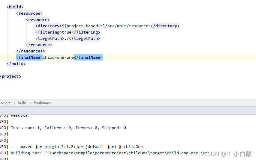 该标签主要是用来打包时做一些处理功能,像资源文件的复制,选择指定的插件以及最终打包的jar包名称等。