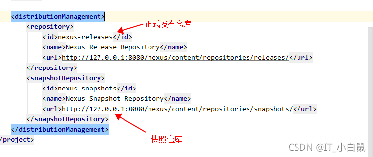 该标签是在Maven的deploy阶段,即将当前项目推送到远程私服的仓库上,以供于他人使用,一般比较大型的公司都会有自己的私服仓库,公司内部自己也会开发一些组件啥的,开发完之后需推送到公司的私服仓库当中,私服后面我也会有一片博客讲解这个东西,在推送的过程中也可以指定推送哪种类型的仓库