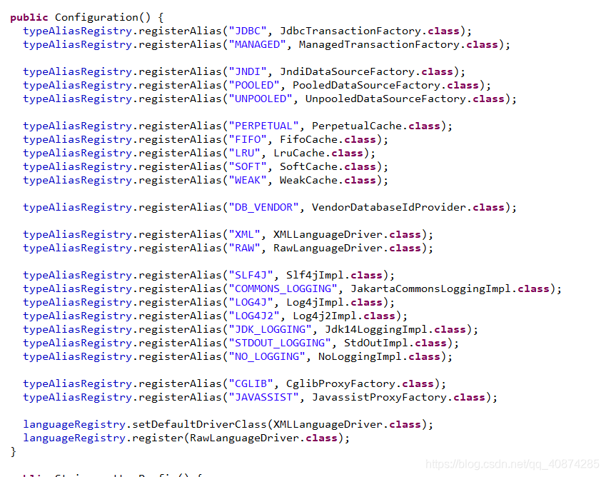 所以别名存储的地方,但是大家可以去看一下Configuration的构造方法,各类的默认参数都已经设置进去,不仅仅是Configuration的构造,在它自己的构造中将jdk自带的一些类也加进去了,这就是为什么有些别名默认就有的原因: