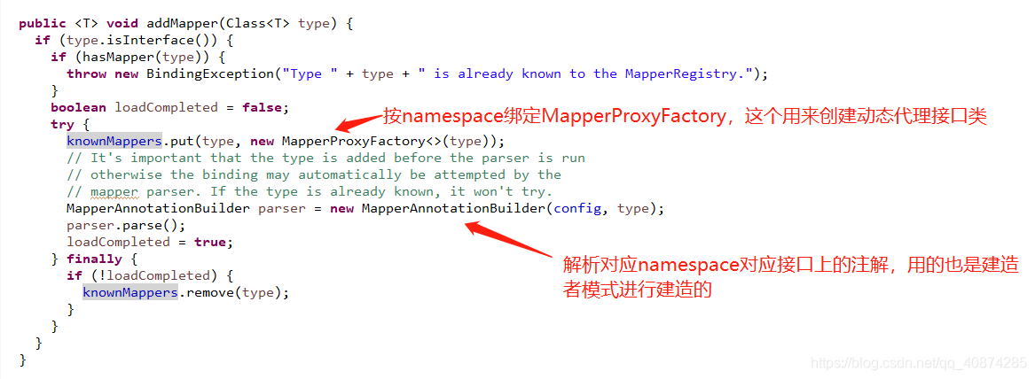 在绑定方法中,如果namespace不是指定的接口全类名,那么就不会被添加到 mapperRegistry对象当中,这个对象就是用来跟接口做绑定的,进入到mapperRegistry的addMapper方法当中,