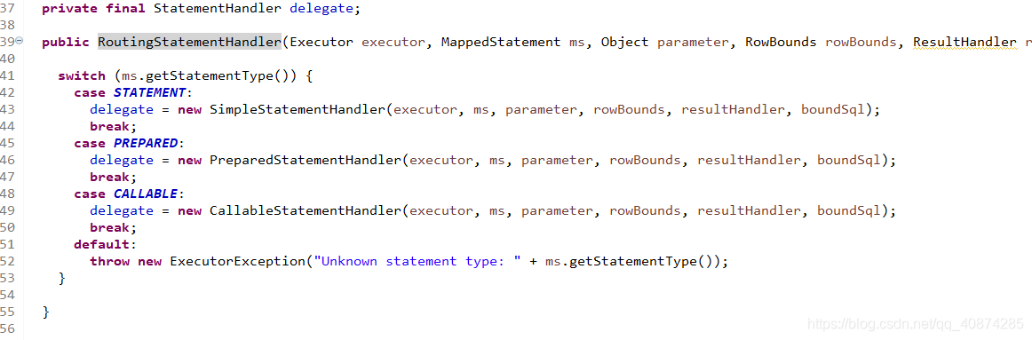 RoutingStatementHandler:Excutor组件 真正实例化的子类,使用静态代理模式, 根据上下文决定创建哪个具体实体类;