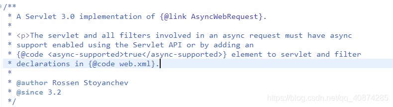 deferredResult.setResult(data);    @RequestMapping("/getWebAsyncTask")@ResponseBodypublic WebAsyncTask<String> asyncTask(){System.out.println("主线程"+Thread.currentThread().getName()+"=>"+System.currentTimeMillis());// 1000 为超时设置,默认执行时间为10秒WebAsyncTask<String> webAsyncTask = new WebAsyncTask<String>(2000L,new Callable<String>(){public String call() throws Exception {System.out.println(Thread.currentThread().getName());//业务逻辑处理Thread.sleep(3000);System.out.println(Thread.currentThread().getName());return "WebAsyncTask success..";}});webAsyncTask.onCompletion(new Runnable() {public void run() {System.out.println(Thread.currentThread().getName()+"调用完成");}});webAsyncTask.onTimeout(new Callable<String>() {public String call() throws Exception {System.out.println(Thread.currentThread().getName()+"业务处理超时");return "<h1>Time Out</h1>";}});System.out.println("主线程"+Thread.currentThread().getName()+"=>"+System.currentTimeMillis());return webAsyncTask;}在异步请求的源码中的注释看到,在用异步的请求之前了都需要在web.xml加上的Servlet上面加上<async-supported>true</async-supported>:
