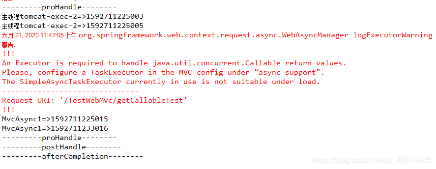 request.setAttribute("org.apache.catalina.ASYNC_SUPPORTED", true);结果发现还是不行,这时逼我改源码呀!最后将StandardServletAsyncWebRequest.java这个类重写了一下,在判断之前设置一下请求属性,这样才好,现在回到异步使用那里,其实在官方还是一种异步的方法,使用WebAsyncTask这个类这个可以增加超时回调结果,在调用中,我们打印一下异步线程名称: