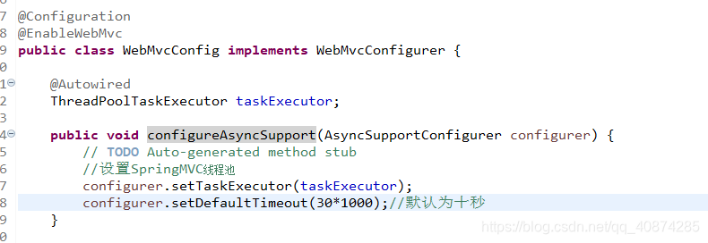/*** Template method for the actual execution of a task.* <p>The default implementation creates a new Thread and starts it.* @param task the Runnable to execute* @see #setThreadFactory* @see #createThread* @see java.lang.Thread#start()*/protected void doExecute(Runnable task) {Thread thread = (this.threadFactory != null ? this.threadFactory.newThread(task) : createThread(task));thread.start();}那我们就先配置一个线程池:创建一个类继承WebMvcConfigurer接口,实现configureAsyncSupport方法: