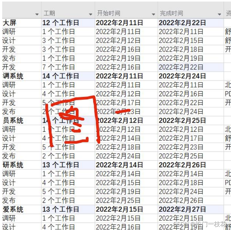 将原来的资源复制到另一列,删除资源名称列里的内容,会发现,排期有了变化,重新分配资源。如下图一(删除前),图二(删除后)