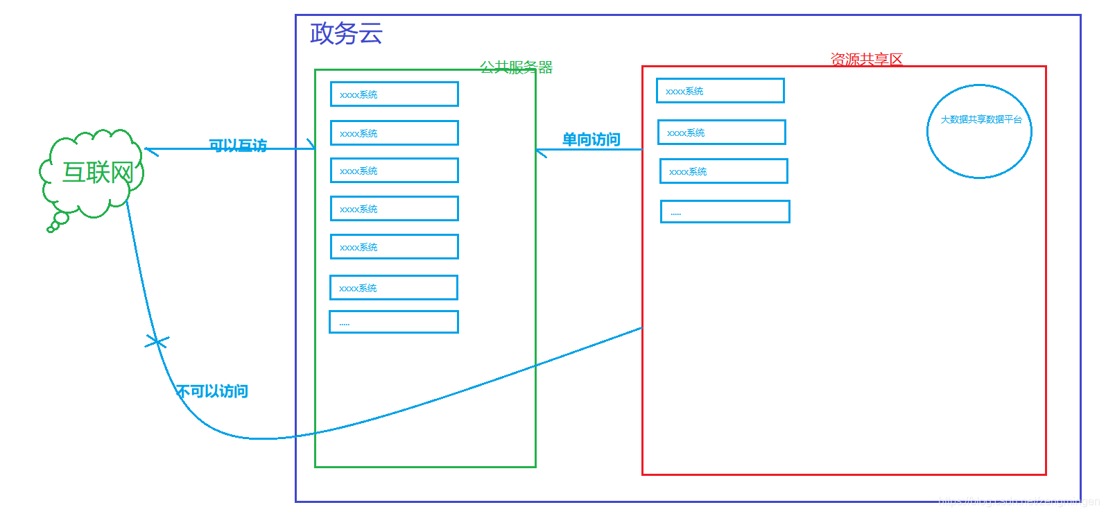 资源共享区,一般部署只能政务云内网访问的系统,不对外公开的系统,数据安全性高的系统,比如退役军人系统,宁波的大数据共享平台,医保系统,财政系统等等。