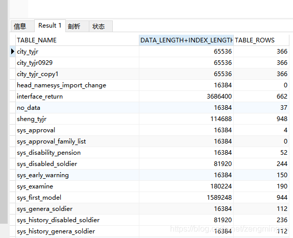 DATA_LENGTH+INDEX_LENGTH 的值除以1024,再除以1024,折算成MB