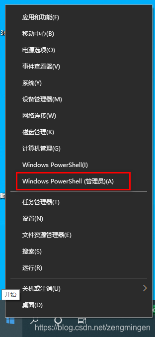1.鼠标移到开始按钮图标上,别动!!!,点击鼠标右键,选择“Windows powershell(管理员)”