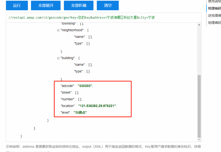 在高德的地理/逆地理编码页面,逆地理编码节点,输入