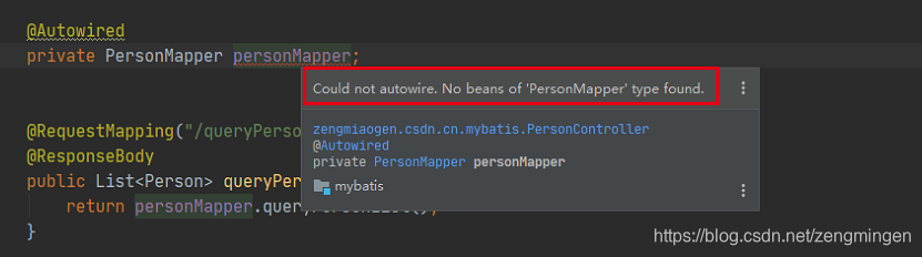 public interface PersonMapper {public List<Person> queryPersonList();}@Mapper 给mybatis的,必须的 @Repository 给spring的,有些idea在编译时会找不到bean,注入失败