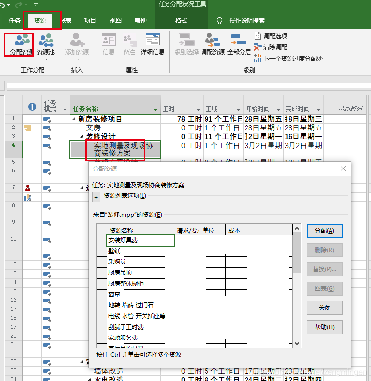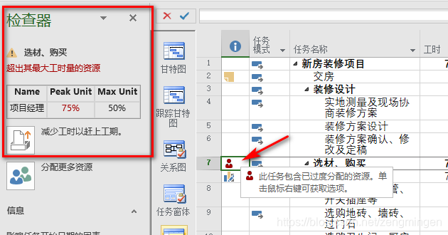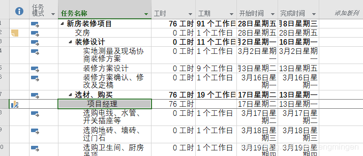 此视图分配给任务分配资源特别方便,分配任务的资源为“项目经理”。