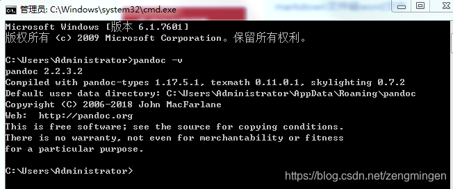 下载pandoc安装包之后,像安装普通软件一样点开安装就可以了。安装完成之后,打开cmd命令行,输入pandoc -v,如果正常显示出类似下面的信息就表明安装成功,如果未成功,可能需要配置环境变量,把安装的路径C:\Users\Frank\AppData\Local\Pandoc\加入环境变量