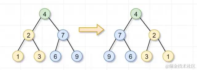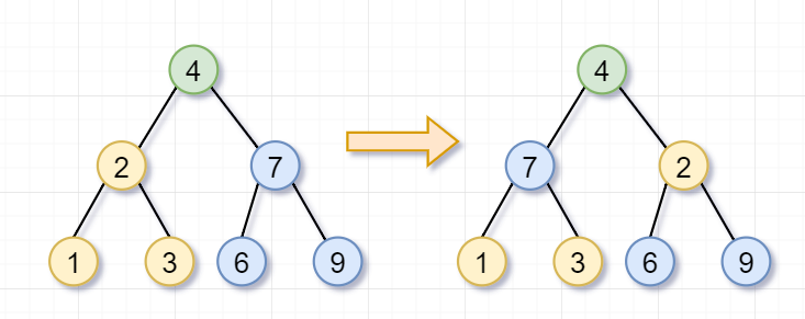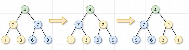 左子树(根节点为2)和右子树(根节点为7)都被翻转完后,这几个步骤就「归来」,即递归的归过程,翻转树的任务就完成了~
