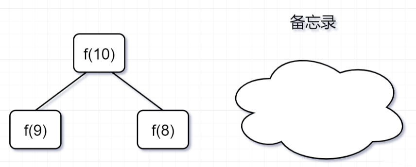 「第一步」,f(10)= f(9) + f(8),f(9) 和f(8)都需要计算出来,然后再加到备忘录中,如下: