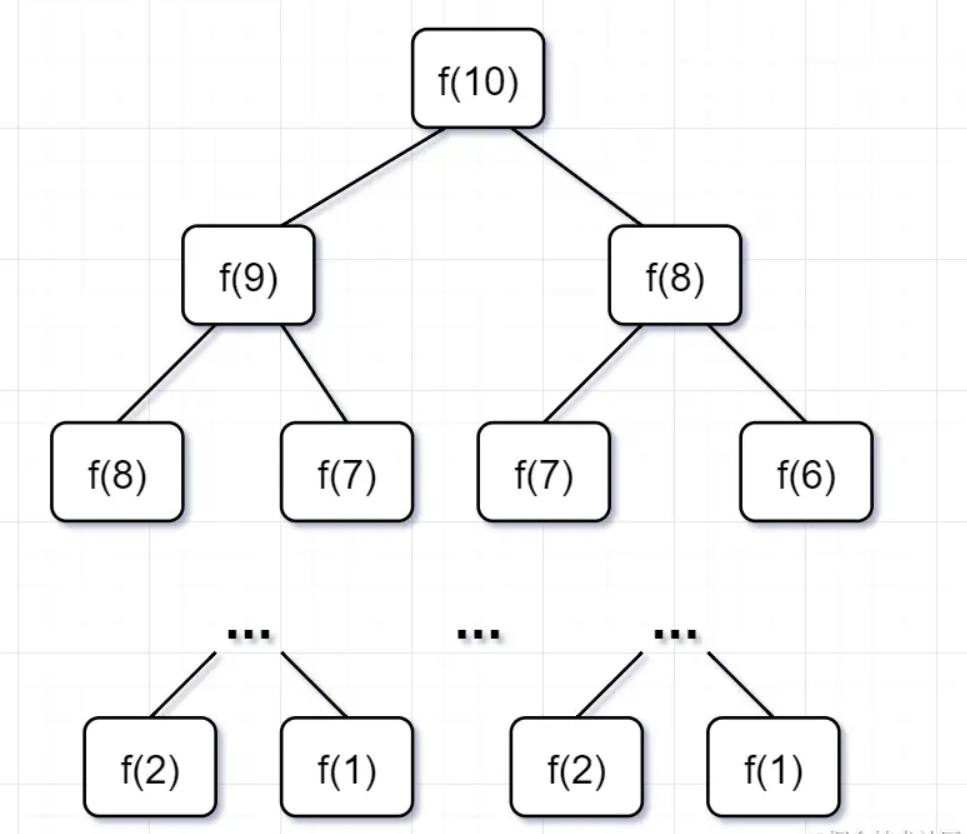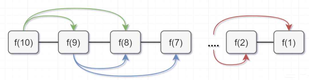 要计算原问题 f(10),就需要先计算出子问题 f(9) 和 f(8)