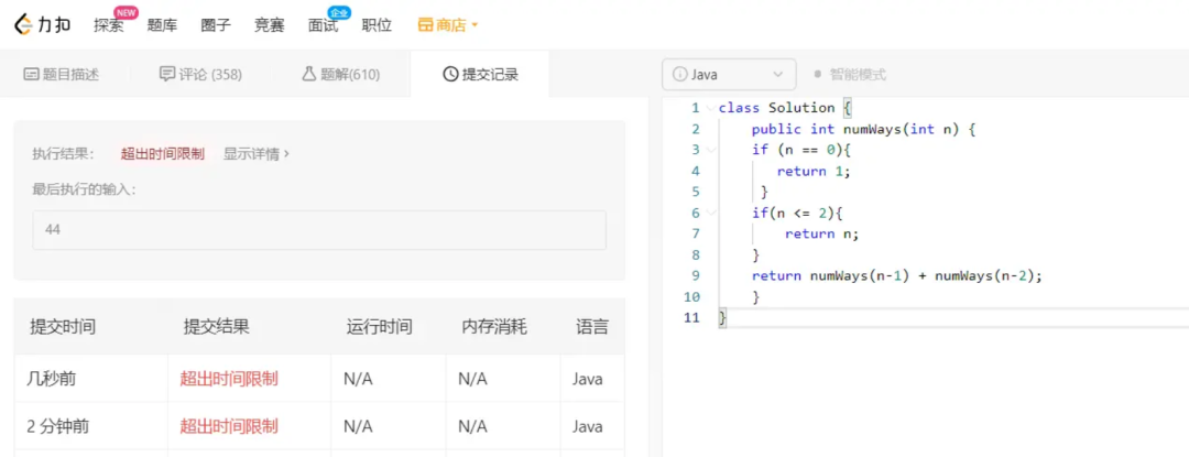 因此,青蛙跳阶,递归解法的时间复杂度 = O(1) * O(2^n) = O(2^n),就是指数级别的,爆炸增长的,「如果n比较大的话,超时很正常的了」。