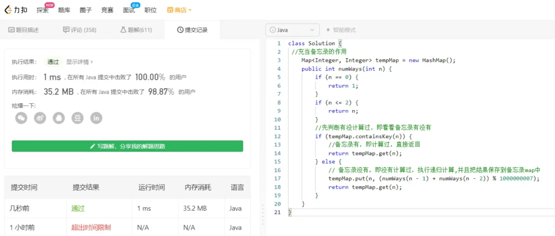 带「备忘录」的递归算法,子问题个数=树节点数=n,解决一个子问题还是O(1),所以「带「备忘录」的递归算法的时间复杂度是O(n)」。接下来呢,我们用带「备忘录」的递归算法去撸代码,解决这个青蛙跳阶问题的超时问题咯~,代码如下: