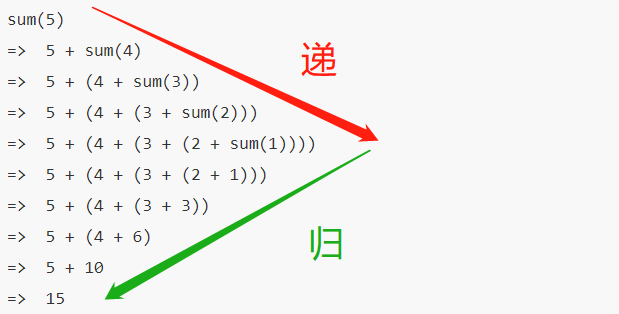 为了更容易理解一些,我们来看一下 函数sum(n=5)的递归执行过程,如下: