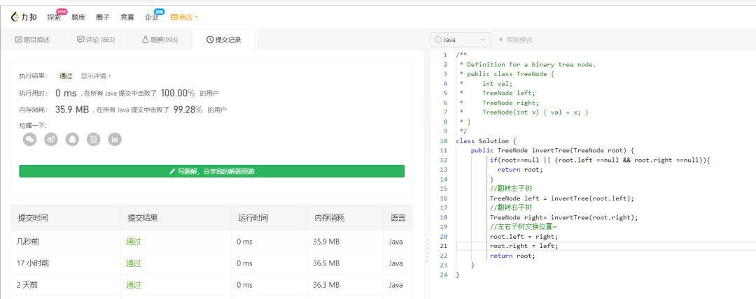 class Solution {public TreeNode invertTree(TreeNode root) {if(root==null || (root.left ==null && root.right ==null)){return root;}//翻转左子树TreeNode left = invertTree(root.left);//翻转右子树TreeNode right= invertTree(root.right);//左右子树交换位置~root.left = right;root.right = left;return root;}