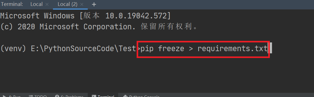 在打开的终端中,输入pip freeze > requirements.txt回车,生成requirements.txt文件