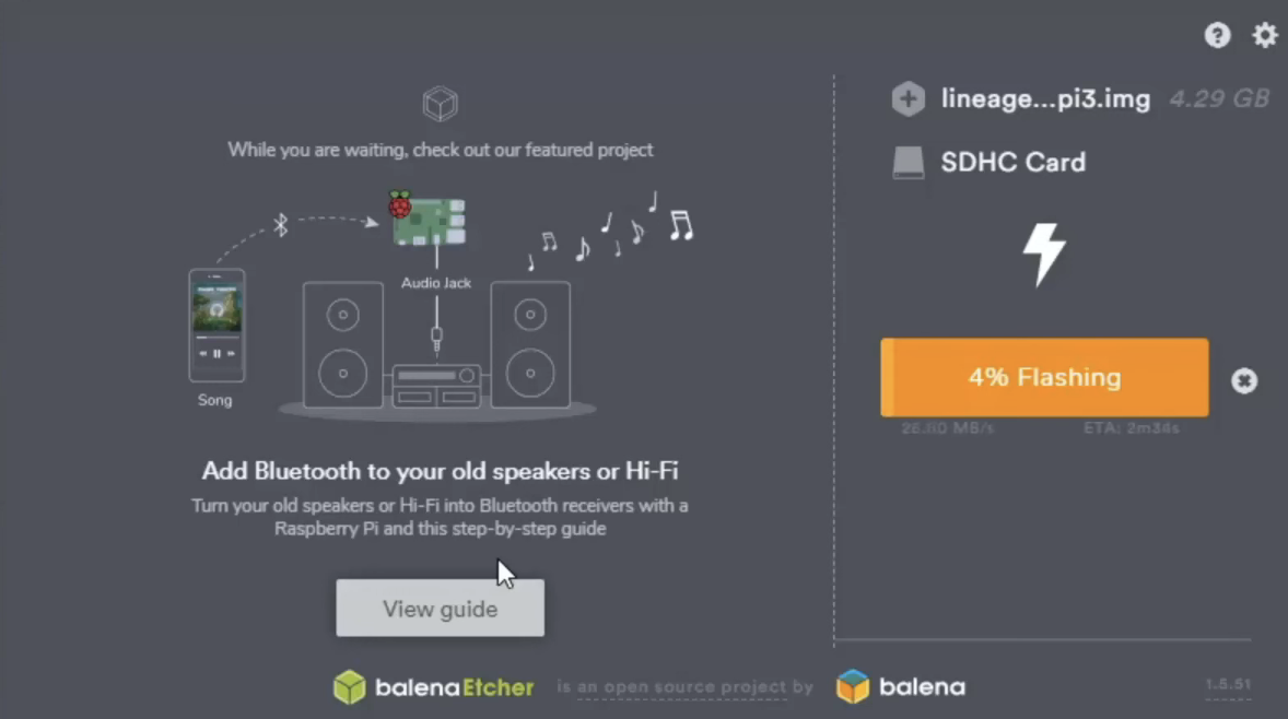 打开Etcher,选择刚才下载的镜像,选择sd卡,等待烧录。