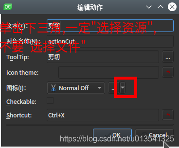 2.打开后缀.ui的可视化设计窗体文件,xxx.ui,在Action Editor中单击上方"新建",在弹出的对话框中的"图标"这项最右边下三角中,一定要"选择资源"(从项目的资源文件中添加需要的图标即可),千万不要"选择文件".