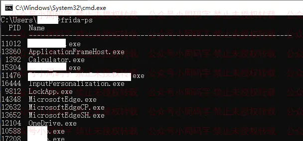 执行一波 pip install frida-tools,安装完毕以后,测试是否安装正确,因为官网安装文档的下半部分是用于测试刚装好的库是否可用,但是比较麻烦,这里可以直接使用 frida-ps 命令来测试(显示本机的进程)