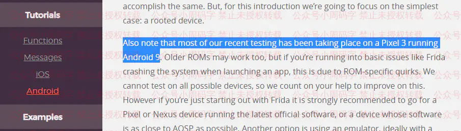 手机准备好了之后,找到 Frida 文档中 Tutorials 栏里的Android页,开始进行Frida的手机端准备工作。