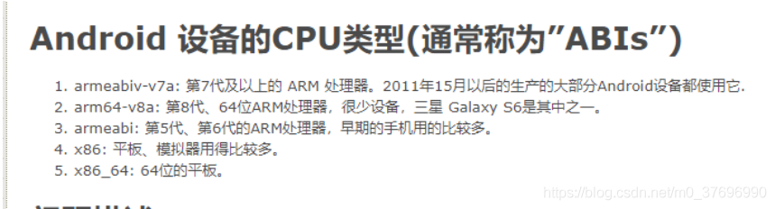 | arm64-v8a | 第8代64位ARM处理器,支持此ABI的手机还比较少 |
