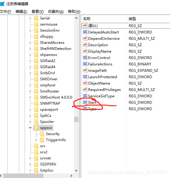 1,找到sppsvc,路径是“计算机\HKEY_LOCAL_MACHINE\SYSTEM\CurrentControlSet\Services\sppsvc”。