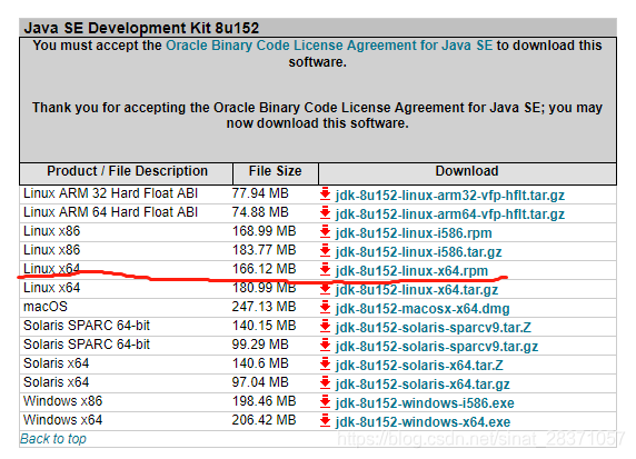 下载 Java SE Development Kit 8u152,文件名:jdk-8u152-linux-x64.rpm,下载地址:https://www.oracle.com/technetwork/java/javase/downloads/java-archive-javase8-2177648.html