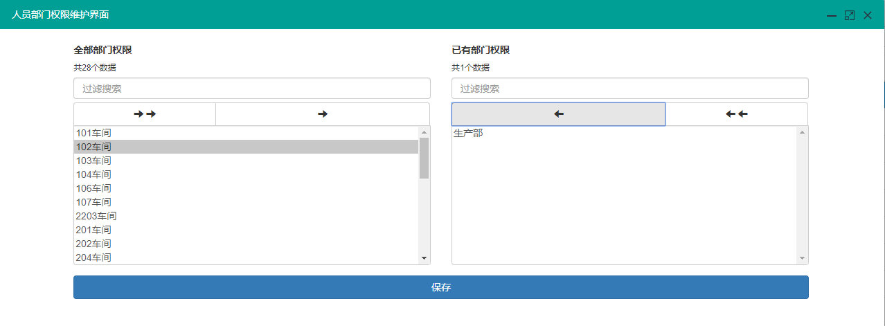 var selectorx;selectorx = $('select[name="groups"]').bootstrapDualListbox({bootstrap3Compatible: true,//设置为Bootstrap3模式preserveSelectionOnMove: 'moved',//选中移动背景变色moveOnSelect: false,//选中即选择nonSelectedListLabel: '全部部门权限',selectedListLabel: '已有部门权限',filterTextClear: '展示所有',filterPlaceHolder: '过滤搜索',moveSelectedLabel: "添加",moveAllLabel: '添加所有',removeSelectedLabel: "移除",removeAllLabel: '移除所有',infoText: '共{0}个数据',infoTextFiltered: '搜索到{0}个数据 ,共{1}个数据',infoTextEmpty: '列表为空',});其他常用方法: