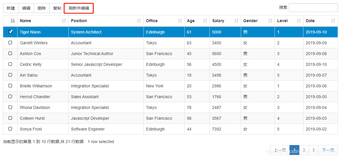 $.fn.dataTable.ext.buttons.editRefresh = {extend: 'edit',text: '刷新并编辑',action: function (e, dt, node, config) {this.processing(true);var selectedRowsIds = dt.rows({ selected: true }).ids();//获取每行在前端自动生成的id数组var selectedRows = dt.rows({ selected: true }).data();//获取选中数据var length = selectedRows.length;//得到选中数据的数组的长度var selectedRowsNames = "";for (var i = 0; i < length; i++) {selectedRowsNames += selectedRows[i].Name;if (i != length - 1){selectedRowsNames += ",";}}var that = this;var url = config.editor.ajax().edit.url;//获得editor中更新出操作的URL$.ajax({url: url,type: 'post',dataType: 'json',data: {refresh: 'rows',names:selectedRowsNames,ids: selectedRowsIds.toArray().join(','),},success: function (json) {// On success update rows with datafor (var i = 0 ; i < json.data.length ; i++) {dt.row('#' + json.data[i].DT_RowId).data(json.data[i]);}dt.draw(false);// And finally trigger editing on those rows$.fn.dataTable.ext.buttons.edit.action.call(that, e, dt, node, config);}});}};然后在datatable 的 button属性中添加一个按钮即可,代码如下图所示:
