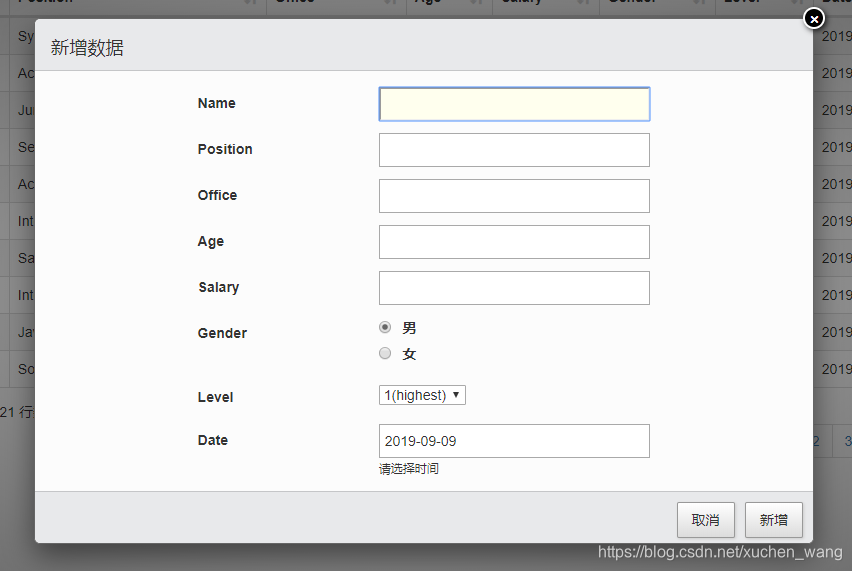 新增界面增加了单选按钮,下拉框,和时间选择器,还有右下角的“取消”按钮: