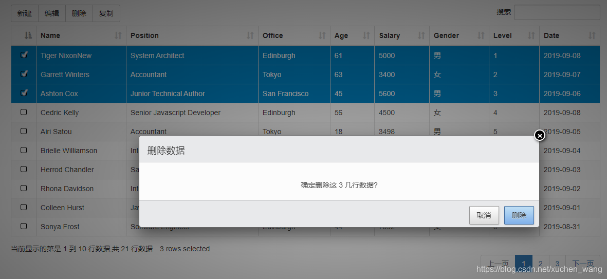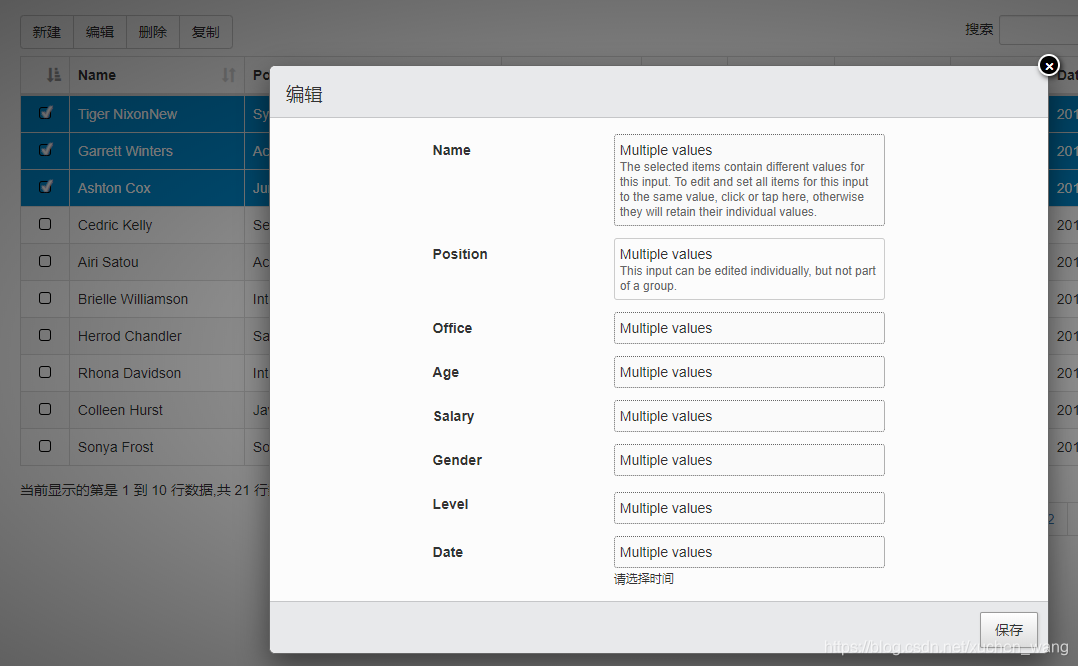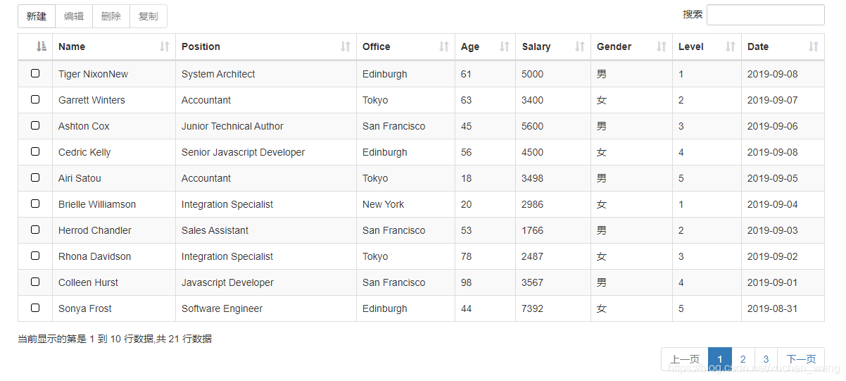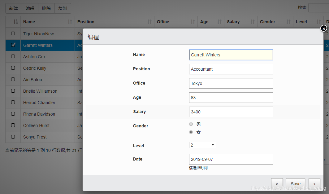 table = $('#example').DataTable({ajax: {url: "/Home/GetData",type: "Get",dataType: "json",data: {},dataSrc: function (json) {$.each(json, function (k, v) {v.DT_RowId = GetRandomRowID();//在前端对服务端返回的数据生成随机字符串作为主键});return json;},error: function () {alert("服务器未正常响应,请重试");},},dom: 'Bfrtip',select: {style: 'os',selector: 'td:first-child'},buttons: [{extend: "create",editor: editor,formButtons: ["新增",{ text: "取消", action: function () { this.close();}}]},//{//    extend: "edit",//原编辑功能代码//    editor: editor,//    formButtons: [//        "修改",//        { text: "取消", action: function () { this.close(); }}//    ]//},{extend: 'selected',text: '编辑',action: function () {var indexes = table.rows({ selected: true }).indexes();editor.edit(indexes, {title: '编辑',buttons: indexes.length === 1 ?backNext :'保存'});}},{extend: "remove",editor: editor,formButtons: ["删除",{ text: "取消", action: function () { this.close();}}]},{extend: "selected",text: '复制',action: function (e, dt, node, config) {// Start in edit mode, and then change to createeditor.edit(table.rows({ selected: true }).indexes(), {title: '复制原数据',buttons: '新增复制'}).mode('create');}},],columns: [{data: null,defaultContent: '',orderable: false,className: 'select-checkbox',},{ title: "Name", data: "Name"},{ title: "Position", data: "Position"},{ title: "Office", data: "Office"},{ title: "Age", data: "Age"},{ title: "Salary", data: "Salary"},{title: "Gender", data: "Gender",render: function (val, type, row) {return val == "1" ? "男" : "女";}},{ title: "Level", data: "Level", className: "dt-body-center" },{ title: "Date", data: "Date",}],language: {processing: "正在获取数据,请稍后...",search: "搜索",lengthMenu: "显示 _MENU_ 条",info: "当前显示的第是 _START_ 到 _END_ 行数据,共 _TOTAL_ 行数据",infoEmpty: "记录数为0",infoFiltered: "((全部记录数 _MAX_ 条))",infoPostFix: "",loadingRecords: "系统处理中,请稍等...",zeroRecords: "没有您要搜索的内容",emptyTable: "没有数据",paginate: {first: "第一页",previous: "上一页",next: "下一页",last: "最后一页"},aria: {sortAscending: "以升序排列此列",sortDescending: "以降序排列此列"}}});后端代码和上一篇中的一样,除了Person实体类需要新增几个属性:
