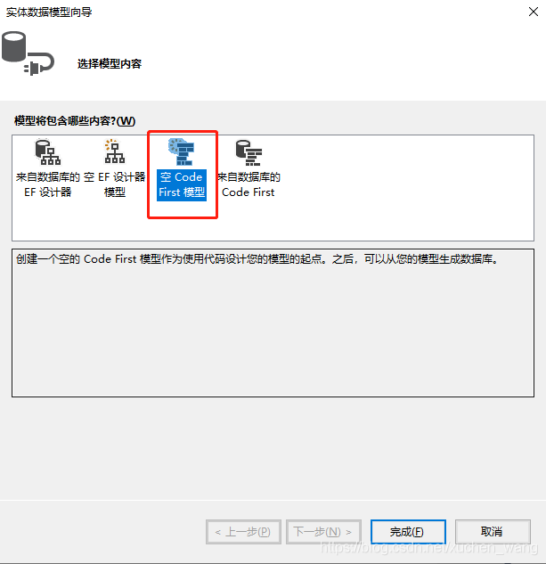 选择“空CodeFirst模型”建立所需的ADO.NET实体数据模型,如下图所示: