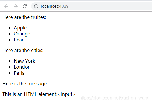public class HomeController : Controller{// GET: Homepublic ActionResult Index(){ViewBag.Fruits = new string[] { "Apple", "Orange", "Pear" };ViewBag.Cities = new string[] { "New York","London","Paris"};string message = "This is an HTML element:<input>";return View((object)message);}}对应的视图Index.cshtml页面,代码如下图所示:
