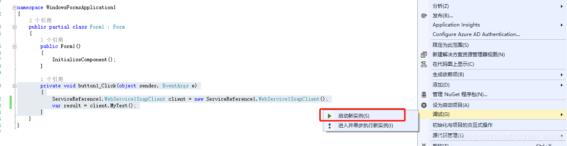 4、选择WebService项目,右键选择“调试” ,“启动新实例”,如下图所示: