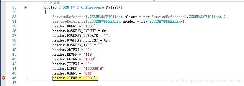 public class WebService1 : System.Web.Services.WebService{[WebMethod]public string HelloWorld(){return "Hello World";}[WebMethod]public int Add(int a, int b) => a + b;[WebMethod]public Z_SRM_PO_D_CRTResponse MyTest(){ServiceReference1.ZSRMPODCRTClient client = new ServiceReference1.ZSRMPODCRTClient();ServiceReference1.ZSSRMPOPRHEADER header = new ZSSRMPOPRHEADER();header.BUKRS = "1001";header.DOWNPAY_AMOUNT = 0m;header.DOWNPAY_DUEDATE = "";header.DOWNPAY_PERCENT = 0m;header.DOWNPAY_TYPE = "";header.QDTEXT = "";header.EKGRP = "119";header.EKORG = "1000";header.JZTEXT = "";header.LIFNR = "10000016";header.WAERS = "CNY";header.ZTERM = "0001";ZSSRMPOPRITEM item = new ZSSRMPOPRITEM();item.EINDT = "2019-07-20";item.ITEM_CAT = "";item.MATNR = "20008966";item.MEINS = "EA";item.MENGE = 40m;item.MWSKZ = "JA";item.NETPR = 40m;item.OVER_DLV_TOL = 0m;item.PEINH = 1m;item.PREQ_ITEM = "";item.PREQ_NO = "";item.STGE_LOC = "";item.UNDER_DLV_TOL = 0m;item.WERKS = "1101";ServiceReference1.ZSSRMPOPRITEM [] items = new ZSSRMPOPRITEM[] { item };ServiceReference1.Z_SRM_PO_D_CRT cat = new ServiceReference1.Z_SRM_PO_D_CRT();cat.ET_ITEM = items;cat.T_DATA = header;cat.TKTEXT = "";Z_SRM_PO_D_CRTResponse reponse = client.Z_SRM_PO_D_CRT(cat);return reponse;}}