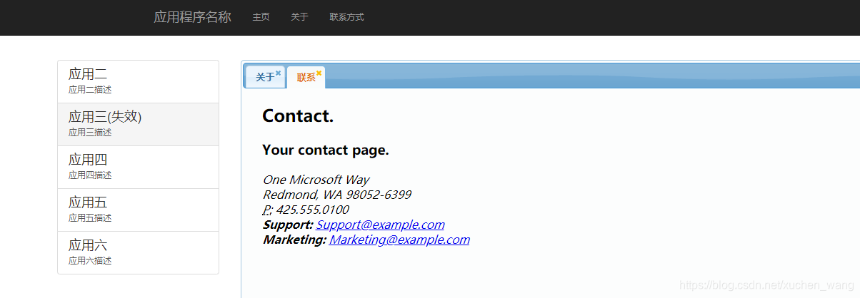 <script type="text/javascript">var tabs;$(document).ready(function () {var h = $(document).height() - 100;$("#tabs").height(h); //如果不设置高度的话,它默认并不是发100%占满屏幕的,所以我这里使用了计算的方式,初始化界面高度tabs = $('#tabs').cleverTabs();$(window).bind('resize', function () {tabs.resizePanelContainer();});});function clickone() {tabs.add({id: 'uniqueId',//id必须唯一url: "/Home/About",label: "关于",});}function clicktwo(){tabs.add({id: 'uniqueId2',url: "/Home/Contact",label: "联系",});}