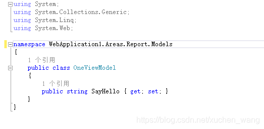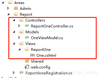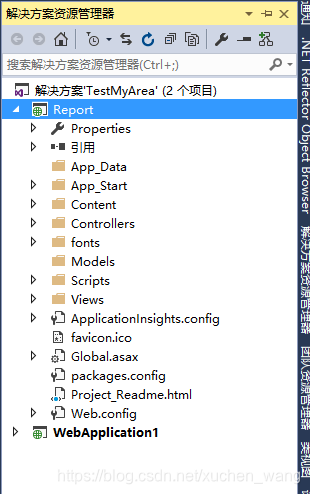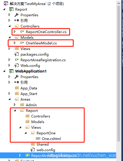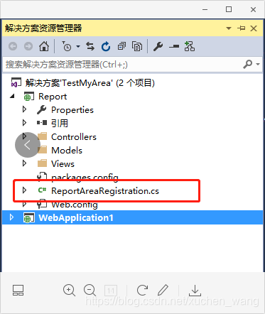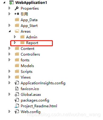 删除Report区域中其他文件,并且将WebApplication中Report区域下的ReportAreaRegistration文件复制到Report项目中,并去掉路由注册的代码,重复的路由注册会报错 ,Report项目的目录如下图所示: