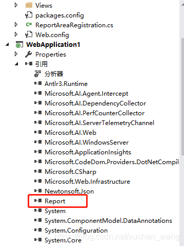 重新编译Report项目生成Report.dll后, WebApplication1项目引用Report.dll,如下图所示: