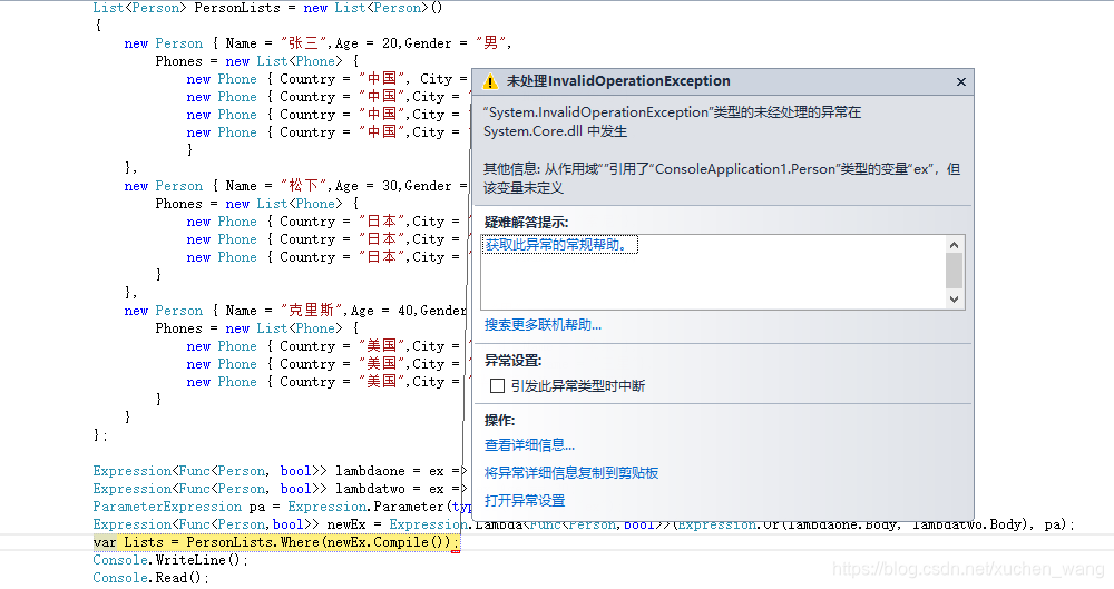 {List<Person> PersonLists = new List<Person>(){new Person { Name = "张三",Age = 20,Gender = "男",Phones = new List<Phone> {new Phone { Country = "中国", City = "北京", Name = "小米" },new Phone { Country = "中国",City = "北京",Name = "华为"},new Phone { Country = "中国",City = "北京",Name = "联想"},new Phone { Country = "中国",City = "台北",Name = "魅族"},}},new Person { Name = "松下",Age = 30,Gender = "男",Phones = new List<Phone> {new Phone { Country = "日本",City = "东京",Name = "索尼"},new Phone { Country = "日本",City = "大阪",Name = "夏普"},new Phone { Country = "日本",City = "东京",Name = "松下"},}},new Person { Name = "克里斯",Age = 40,Gender = "男",Phones = new List<Phone> {new Phone { Country = "美国",City = "加州",Name = "苹果"},new Phone { Country = "美国",City = "华盛顿",Name = "三星"},new Phone { Country = "美国",City = "华盛顿",Name = "HTC"}}}};Expression<Func<Person, bool>> lambdaone = ex => ex.Name.Equals("张三");Expression<Func<Person, bool>> lambdatwo = ex => ex.Age == 30;ParameterExpression pa = Expression.Parameter(typeof(Person), "ex");Expression<Func<Person,bool>> newEx = Expression.Lambda<Func<Person,bool>>(Expression.Or(lambdaone.Body, lambdatwo.Body), pa);var Lists = PersonLists.Where(newEx.Compile());Console.WriteLine();Console.Read();